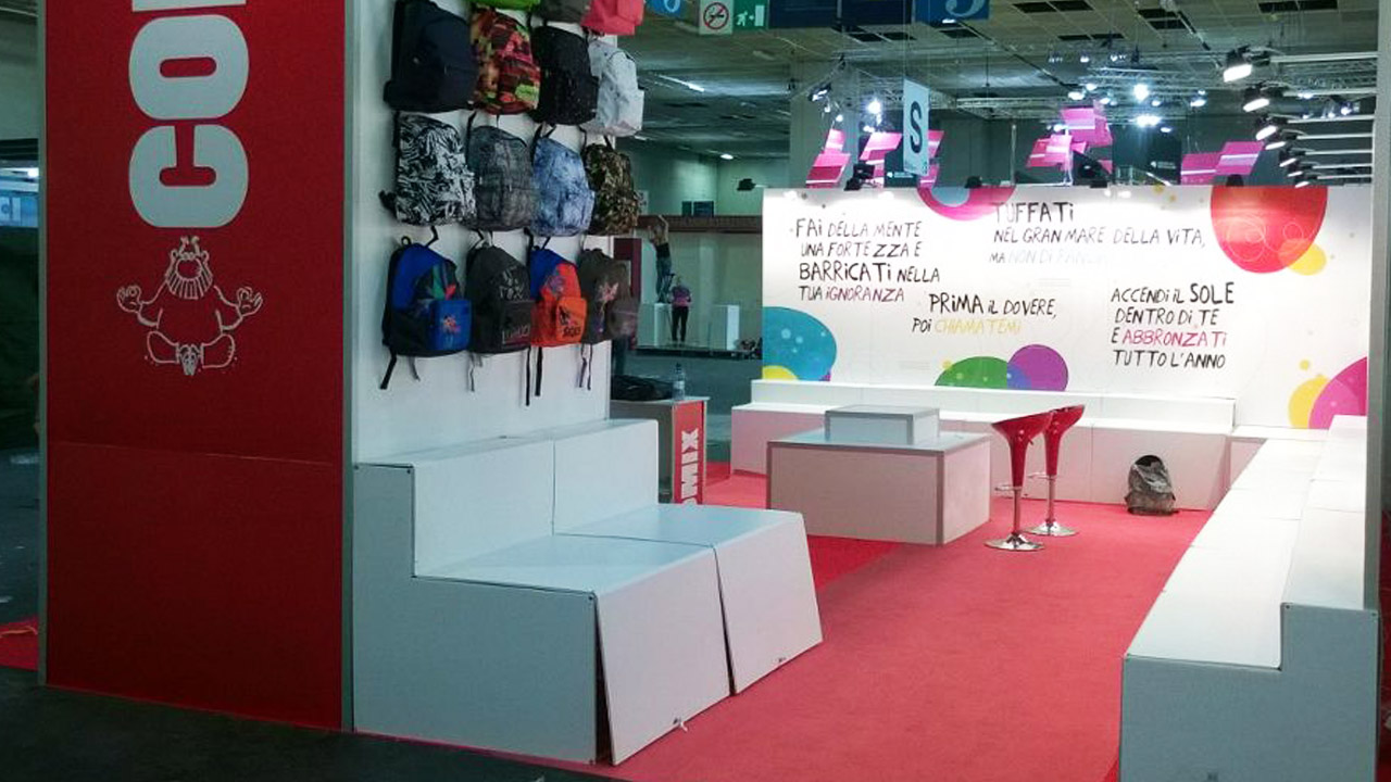 Stand modular y combinable para la Feria del Libro de Turín para Cosimo Panini, con una torre de 5 metros de altura para utilizar como almacén. En todo el perímetro hemos realizado una serie de expositores con compartimentos abribles , donde guardar libros durante el evento. La estructura es de aluminio y el revestimiento de Fastflex.