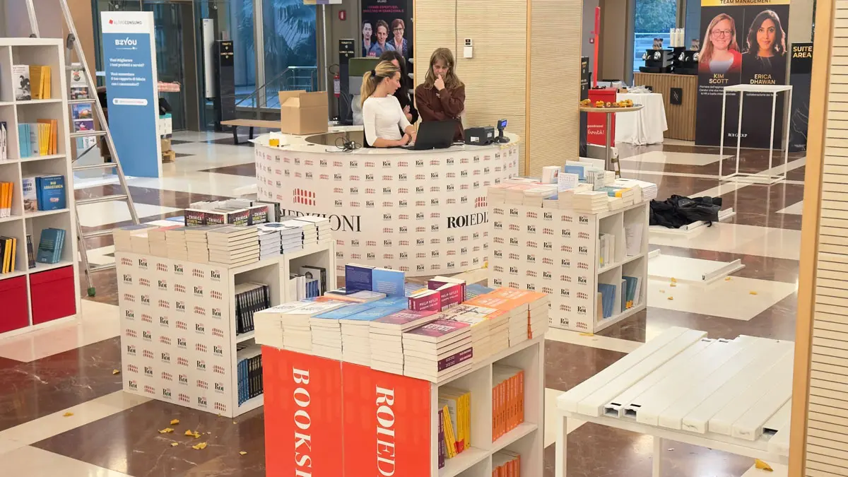 Foto tomada durante la preparación de un evento editorial, el cliente monta un desk circular modular modelo Esfera, compuesto por 7 módulos. Excelente como recepción de clientes y promoción de libros.