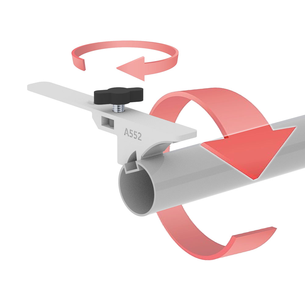 Se sustituye el clásico gancho metálico por este sistema de corredera. La característica es que al deslizarse hacia delante entra en el tope del tubular bloqueando la rotación, pero además se utiliza también durante el uso del roll-up para poder decidir y gestionar la inclinación de la lona gráfica permitiendo un resultado perfecto del display y una absoluta perfección formal.